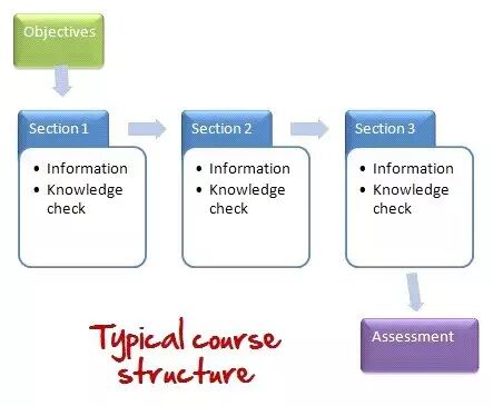 我研究了很多课程。一般来说,它们看起来都沿袭着一个相似的框架。首先,由目标开始,然后跳入课程内容,最后以测验结束。有一些还会在课程内容中安插一些知识检查,来检验学习者的学习进展。因此,一个典型的课程差不多就像这样: