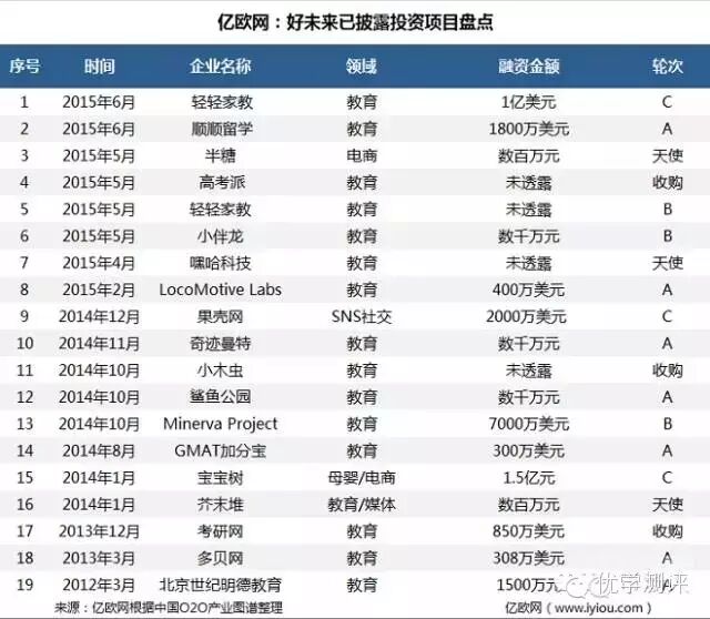 此前,还有内部人员向亿欧网透露,目前好未来投资的项目已有几十家,而经披露的只有十几家,分别是:轻轻家教、顺顺留学、半糖、高考派、小伴龙、嘿哈科技、LocoMotive Labs、果壳网、奇迹曼特、小木虫、鲨鱼公园、Minerva、GMAT加分宝、宝宝树、芥末堆、考研网、多贝网、北京世纪明德教育。