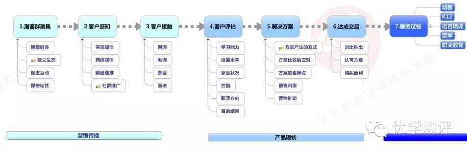 给大家介绍了教育机构为客户提供的价值链和整个服务全过程,前面的七步是共性的,后面的业务提供的服务流程是各品类不同,但其中,都能找出客户关注的新点,但机构还没有抓住的。