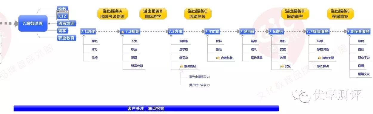大家可以看到7.1、7.2、7.3、7.4的上面我用黄色来标识是“溢出服务”,溢出服务是指留学服务过程中,它有一些服务不是在留学规划这个服务过程中能够解决的,它是客户需要解决出国留学这个“目的”,所衍生出来的服务,我们称为溢出服务。