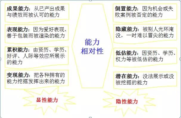因此,能力存在相对性的特征,由显性能力与隐性能力构成,如下图所示: