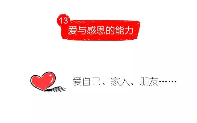 13、爱与感恩的能力:爱是什么?这是一种很难言语的能力,但是对每个人而言,首先要学习的是是“爱自己”,因为一个不懂的如何珍爱自己的人是不太可能真正地懂得如何爱别人,同样感恩也是另外一种幸福的密码,一个具备感恩能力的人,每天都会很开心地想到别人的好,而一个贪婪的人则会抱怨我为什么得到的这么少?这决然会是两种不同的人生境界。