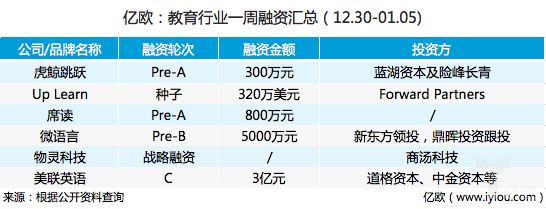在过去一周(12.30-01.05)里,教育领域共有6家企业获得融资,轮次均在早期,融资金额相对较小,值得关注的是美联英语获得3亿元C轮融资。