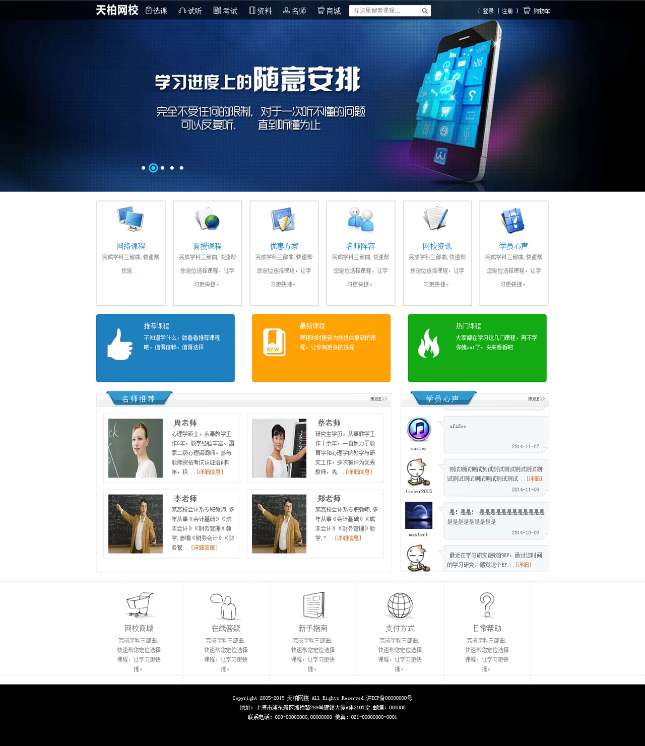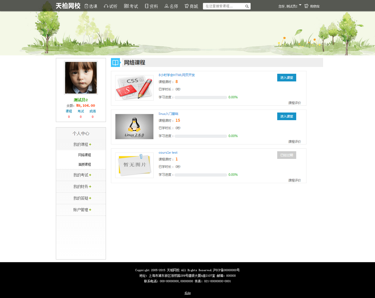 面对着巨大的网络教育市场,培训机构面临的一个新的问题是如何建立属于自已的网校,同时又不要花太多的费用。为了解决客户问题,我们在承接传统教育理念的基础之上,利用信息新技术开发出了天柏在线培训系统(网校版),